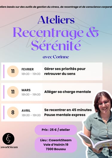 Ces ateliers ont été imaginés pour celles et ceux qui se sentent souvent fatigués mentalement, sous pression, dans la tête en permanence… et qui ressentent le besoin de souffler, de se recentrer et de retrouver plus de légèreté dans leur quotidien.